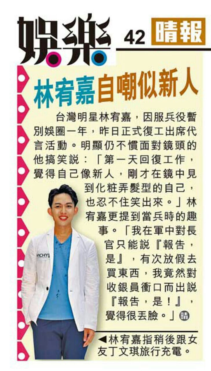 台灣明星林宥嘉,因服兵役暫別娛圈一年,昨日正式復工出席代言活動。明顯仍不慣面對鏡頭的他搞笑說:「第一天回復工作,覺得自己像新人,剛才在鏡中見到化粧弄髮型的自己,也忍不住笑出來。」林宥嘉更提到當兵時的趣事。「我在軍中對長官只能說『報告,是』,有次放假去買東西,我竟然對收銀員衝口而出說『報告,是!』,覺得很丟臉。」